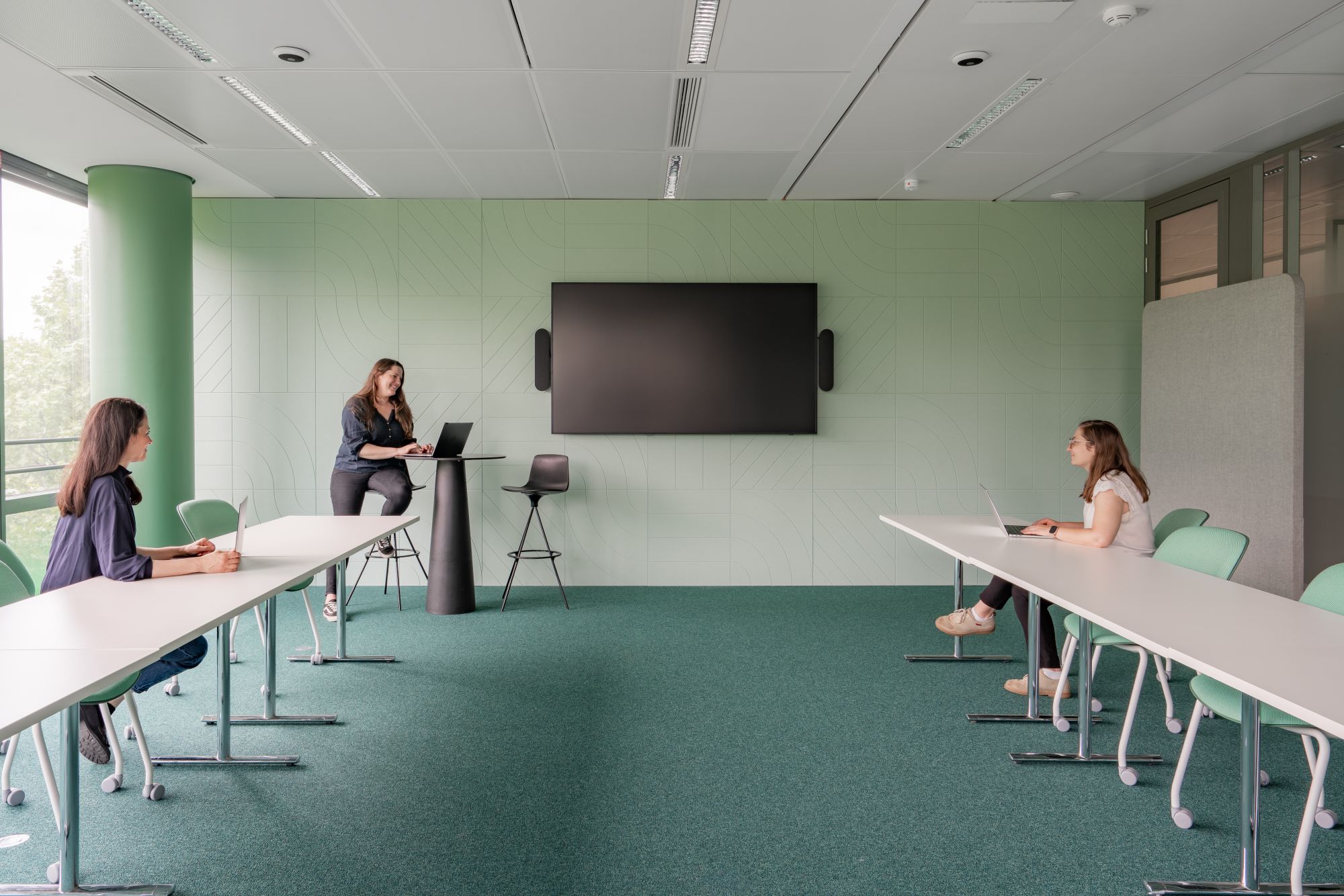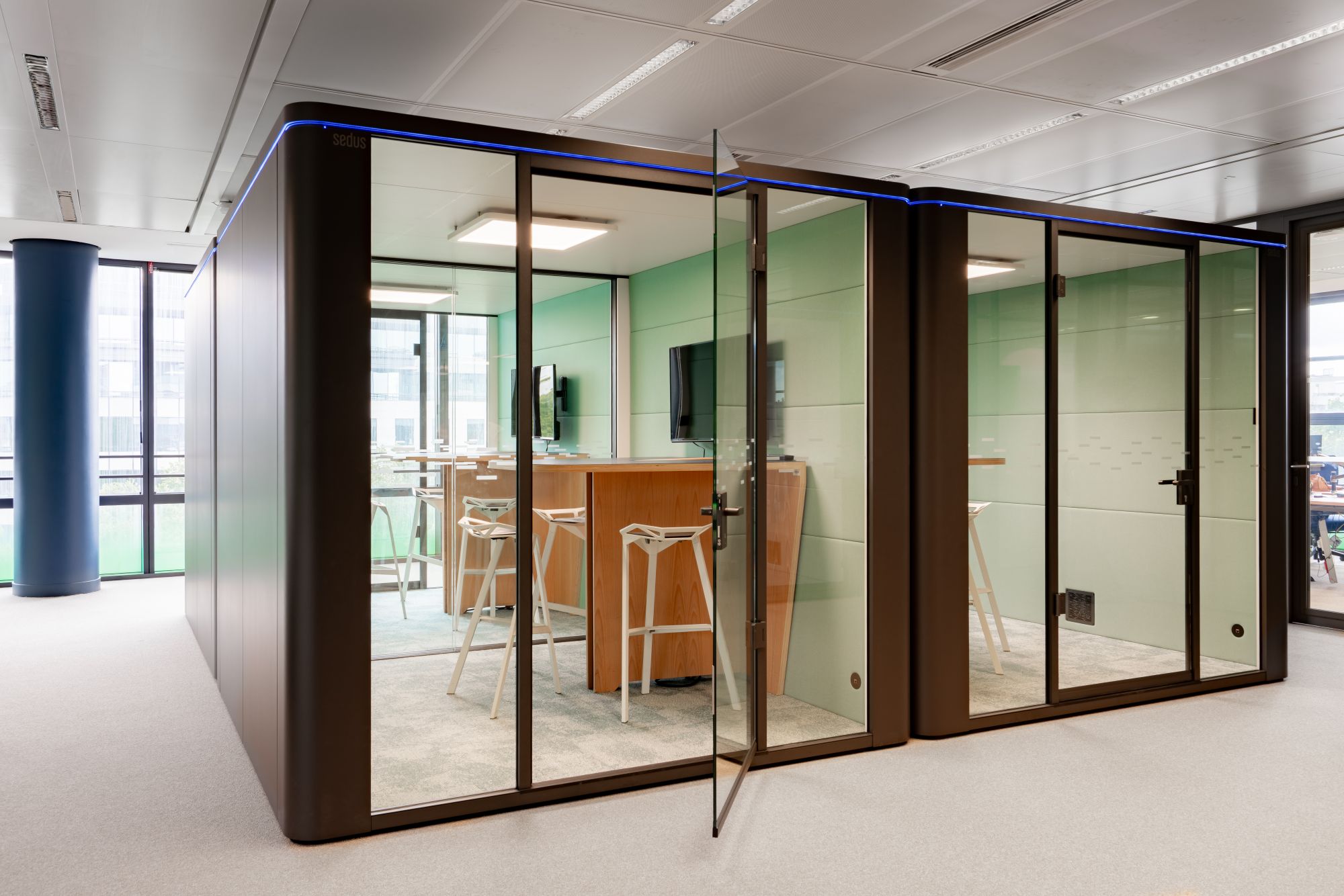 Chaque typologie d’espace – bureaux fermés, open spaces, cabines, salles de réunion – a été pensée pour répondre à des usages spécifiques, favorisant ergonomie, confort et performance collective.
