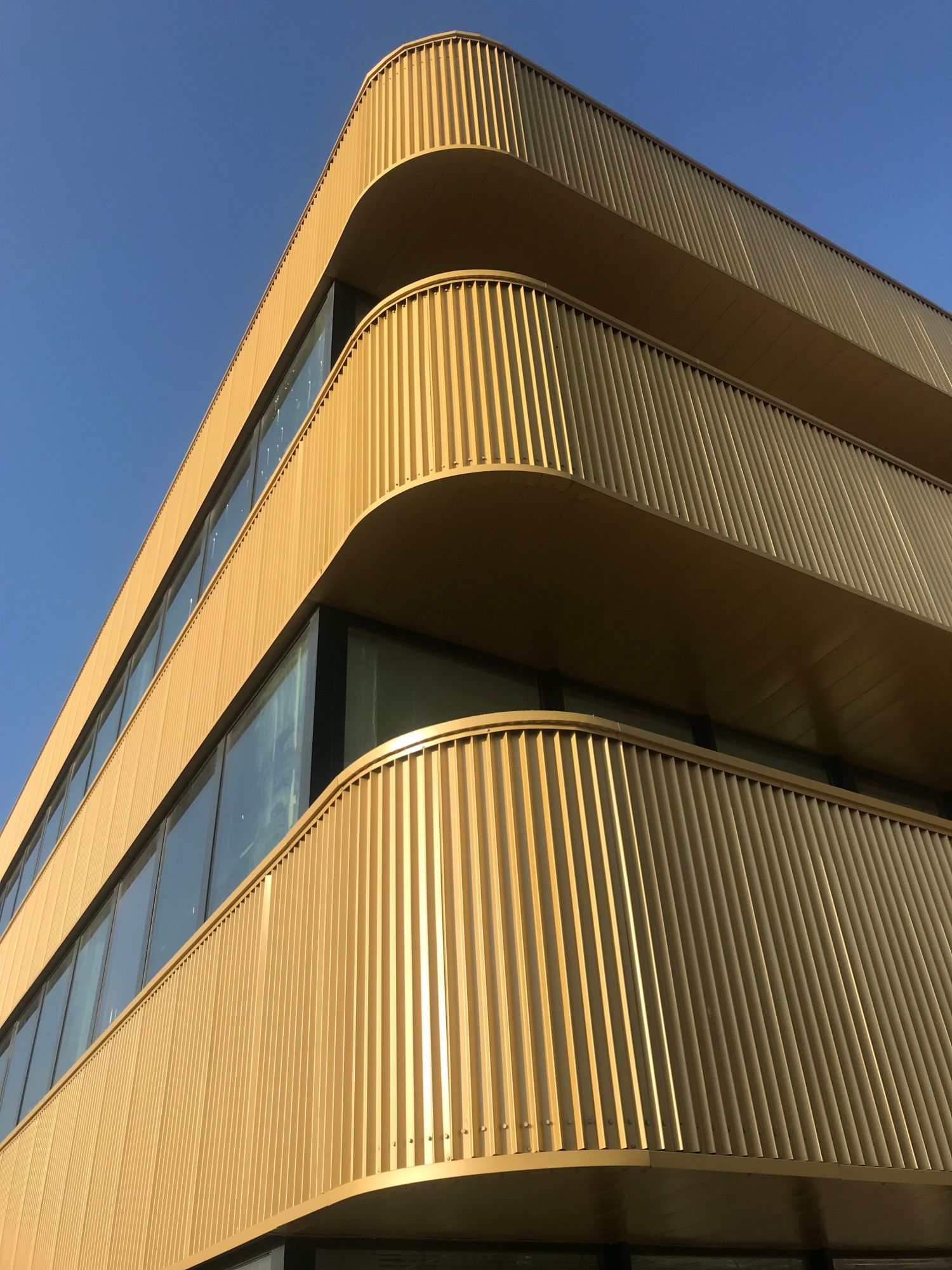 Die vertikale Entwicklung des Gebäudes besteht aus großen, übereinander liegenden Platten, deren äußere Erweiterungen große Terrassen mit variabler Spannweite und Ausrichtung bilden. Diese Terrassen bieten eine privilegierte visuelle Beziehung zum Meer, westlich von Marseille, mit einem Spiel von polarisiertem Licht bei Sonnenuntergang, das mit der goldfarbenen Verkleidung spielt. Die Farbe der Verkleidung trägt dazu bei, dass AZUREA mit der Landschaft verschmilzt. Schließlich schlägt das Gebäude vor, mit der Variation von Stimmungen, Farben und Lichtern je nach Tageszeit zu spielen: weiches Licht am Morgen, stärkeres Licht zur Mittagszeit und eine breite Palette von Abstufungen am Ende des Tages.