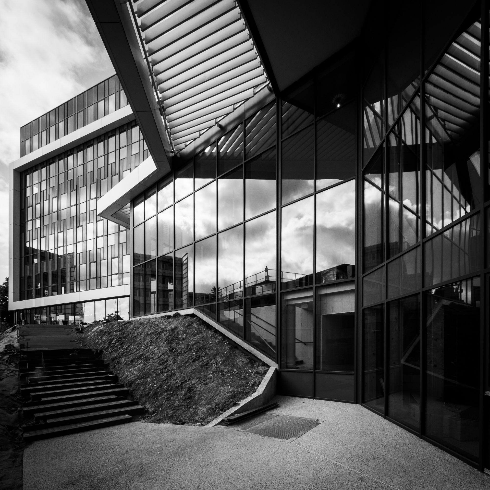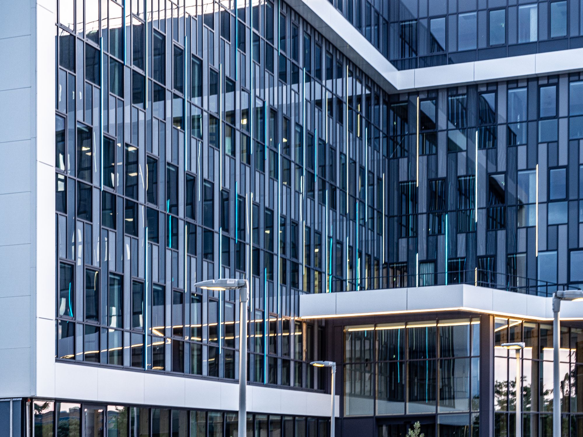 La façade principale en mur rideau, encadrée par le ruban, est soigneusement calepinée avec une alternance d’éléments vitrés et pleins. Un éclairage de mise en valeur aux couleurs d’AIRBUS est déployé sur la façade et bien visible depuis la rocade. L’organisation des espaces lui permet de bénéficier d'espaces extérieurs végétalisés et aménagés.